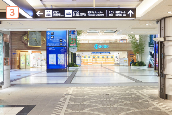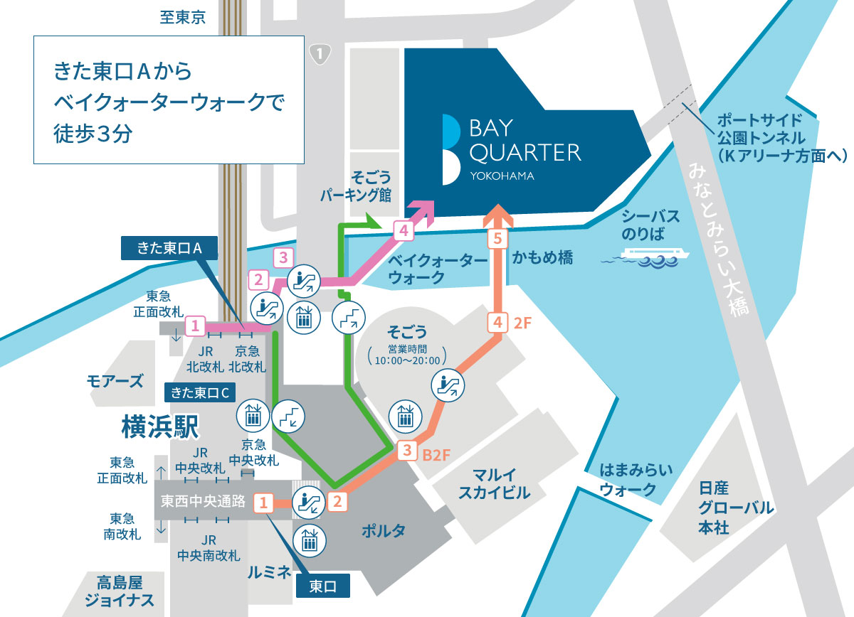 - ※そごう横浜店へは、3Fよりかもめ橋を渡ってください。横浜ベイクォーターの3階とそごう横浜店の2階が、かもめ橋で接続されています。