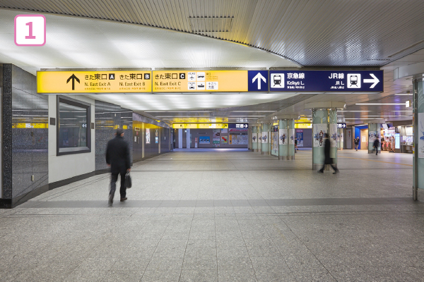 横浜駅 東西中央通路を東口方面へ向かい、下りの階段・エスカレーターで地下街「ポルタ」へ向かいます。エレベーターは右手奥にあります。