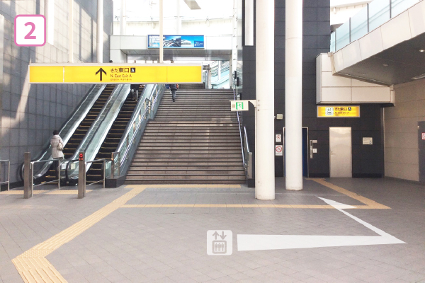 階段・エスカレーターで上へ登ります。エレベーターは右手にあります。