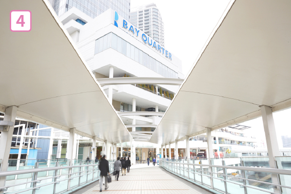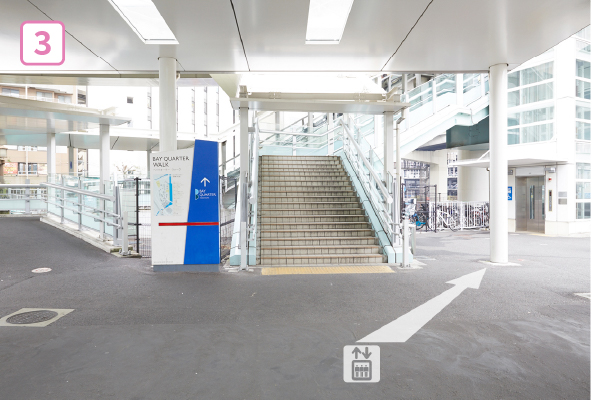 もう一度階段・エスカレーターで上へ登り、「ベイクォーターウォーク」という歩道橋へ進みます。エレベーターは右手にあります。