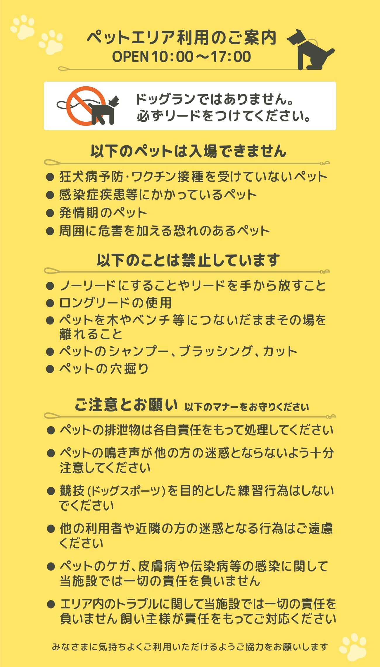 - リードを装着ください。「ペットエリア」については以下のルールをご覧ください。